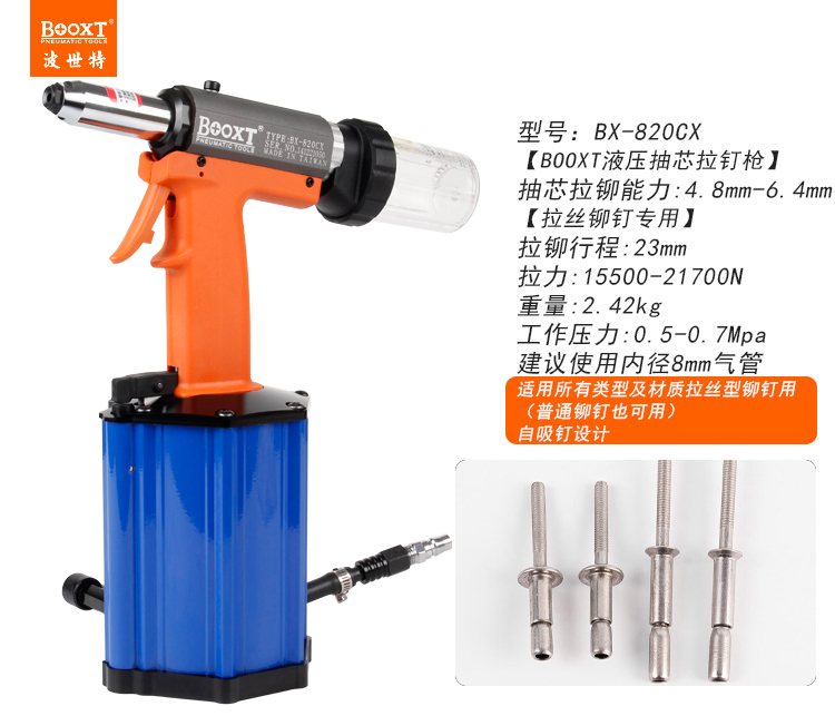 東莞市強勁五金工具有限公司提供臺灣BOOXT波世特品牌氣動工具,氣動拉鉚釘槍BX-820CX廠家直銷,首件享特價。咨詢熱線:4008301980