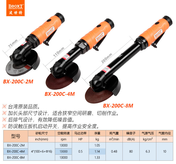 東莞市強勁五金工具有限公司提供臺灣BOOXT波世特品牌氣動工具,加長氣動角磨機BX-200C-8M廠家直銷,首件享特價。咨詢熱線:4008301980