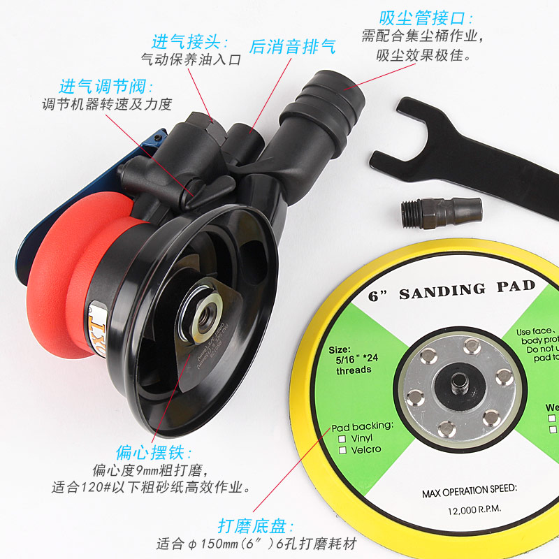• 產(chǎn)品參數(shù): 底盤尺寸:150mm 空載轉(zhuǎn)速:11000rpm 偏擺直徑:9mm 重 量:0.9kg 耗 氣 量:1.6cfm/min(粗磨/中央吸塵)