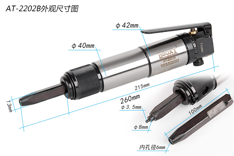 • 產(chǎn)品參數(shù): C型銷(xiāo)直徑:2-6mm 開(kāi)口緊度:0.2-0.5mm 沖擊頻率:5000次/min 活塞沖程:33mm 耗 氣 量:3cfm 機(jī)器長(zhǎng)度:215mm 帶頭長(zhǎng)度:260mm 重 量:1.62kg