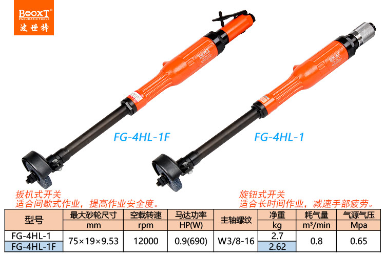 東莞市強勁五金工具有限公司提供臺灣BOOXT波世特品牌氣動工具,加長直柄風動砂輪機FG-4HL-1廠家直銷,首件享特價。咨詢熱線:4008301980