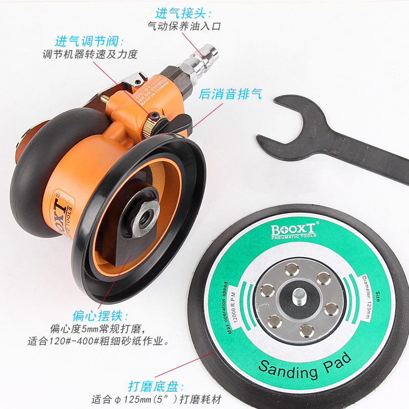• 產(chǎn)品參數(shù): 底盤尺寸:125mm 空載轉(zhuǎn)速:10000rpm 偏擺直徑:5mm 重 量:0.82kg 耗 氣 量:0.48m3/min(中磨)