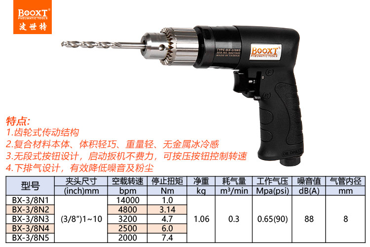東莞市強(qiáng)勁五金工具有限公司提供臺(tái)灣BOOXT波世特品牌氣動(dòng)工具,高速氣鉆BX-3/8N1廠(chǎng)家直銷(xiāo),首件享特價(jià)。咨詢(xún)熱線(xiàn):4008301980