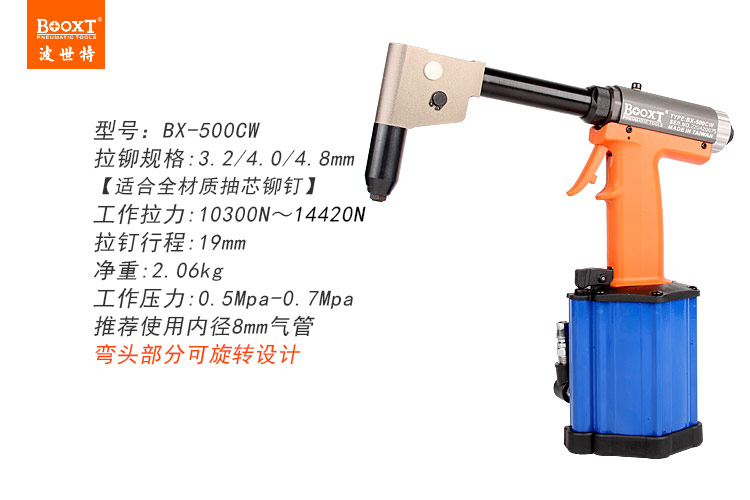 東莞市強勁五金工具有限公司提供臺灣BOOXT波世特品牌氣動工具,彎頭氣動拉釘槍BX-500CW廠家直銷,首件享特價。咨詢熱線:4008301980