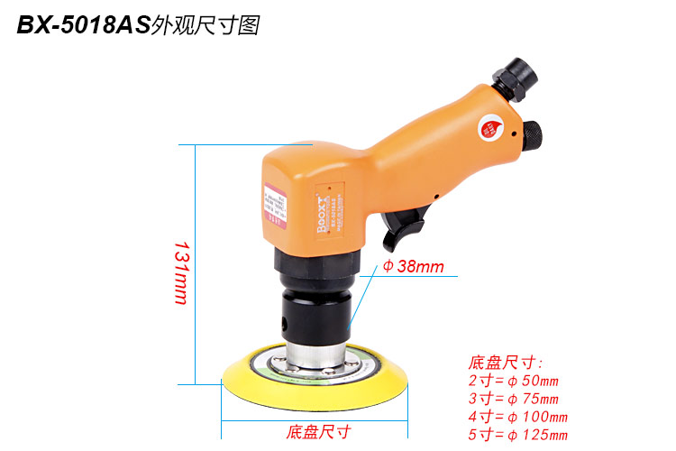 • 產(chǎn)品參數(shù): 底盤尺寸:75mm-125mm(3"-5") 空載轉(zhuǎn)速:16000rpm 耗 氣 量:0.48m3/min 全 長(zhǎng):131mm 重 量:1.06kg
