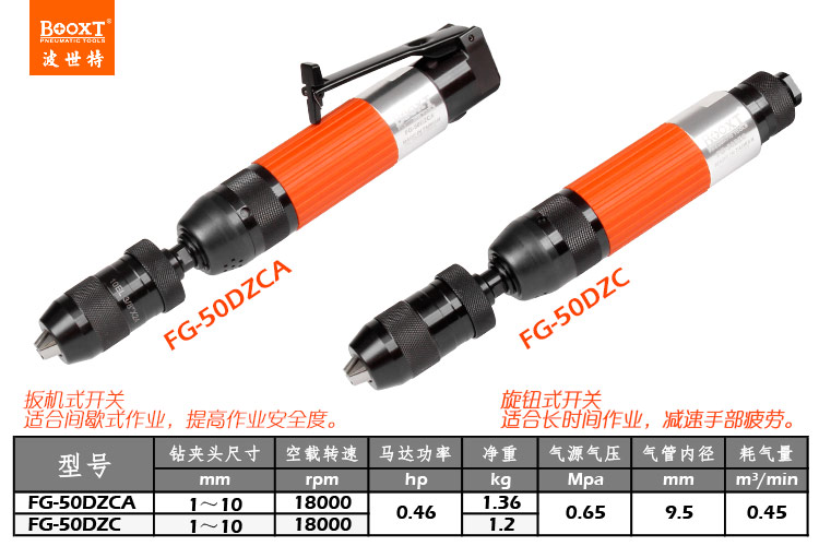 東莞市強勁五金工具有限公司提供臺灣BOOXT波世特品牌氣動工具,自鎖風(fēng)動鉆FG-50DZCA廠家直銷,首件享特價。咨詢熱線:4008301980