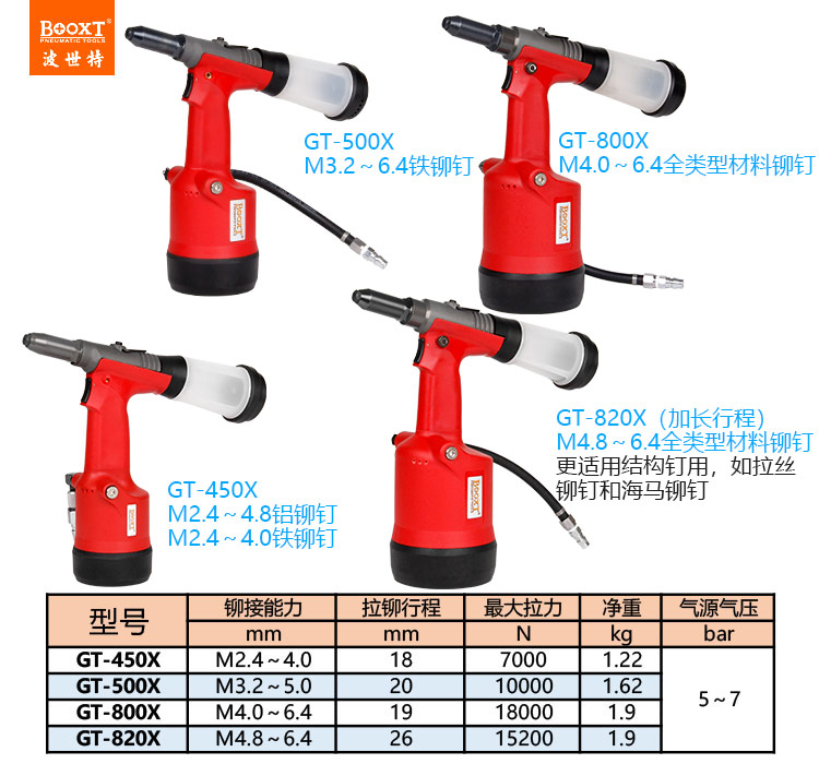 東莞市強勁五金工具有限公司提供臺灣BOOXT波世特品牌氣動工具,氣動鉚釘槍GT-450X廠家直銷,首件享特價。咨詢熱線:4008301980