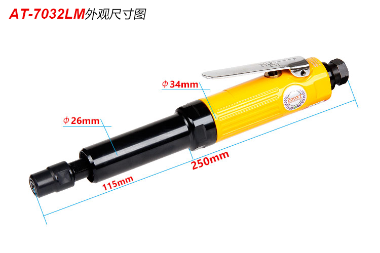 • 產(chǎn)品參數(shù): 夾頭能力:M3,M6 【標配M6】 馬達功率:0.3HP 空載轉(zhuǎn)速:25000rpm 長桿直徑:26mm 長桿長度:115mm 全 長:250mm 重 量 : 0.54kg 耗 氣 量:0.45m3/min 【專業(yè)型】