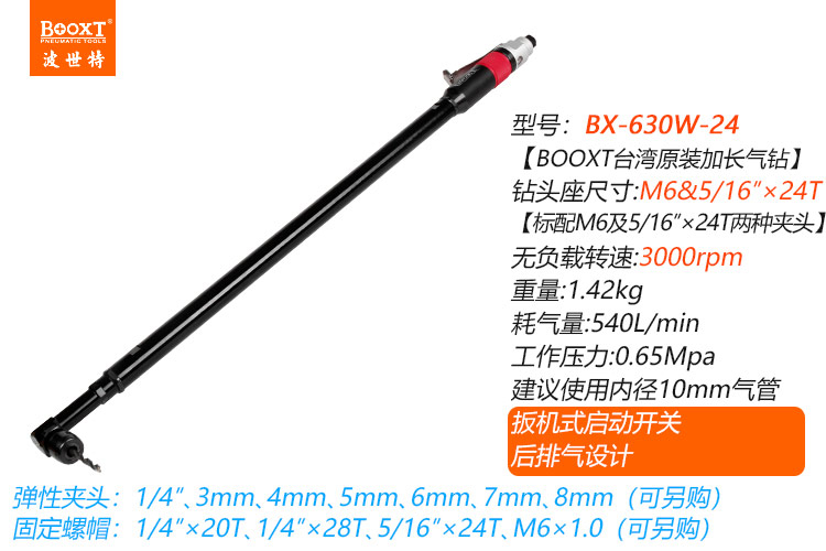 東莞市強(qiáng)勁五金工具有限公司提供臺(tái)灣BOOXT波世特品牌氣動(dòng)工具,特加長(zhǎng)螺牙柄氣動(dòng)鉆BX-630W-24廠家直銷,首件享特價(jià)。咨詢熱線:4008301980