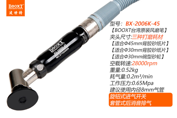 東莞市強勁五金工具有限公司提供臺灣BOOXT波世特品牌氣動工具,彎頭氣動打磨筆BX-2006K-45廠家直銷,首件享特價。咨詢熱線:4008301980