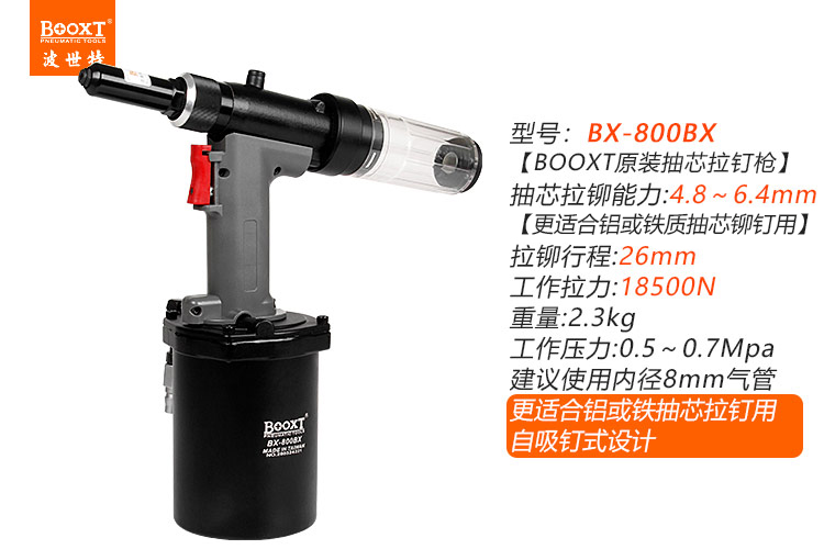 東莞市強勁五金工具有限公司提供臺灣BOOXT波世特品牌氣動工具,自吸式氣動拉釘槍BX-800BX廠家直銷,首件享特價。咨詢熱線:4008301980