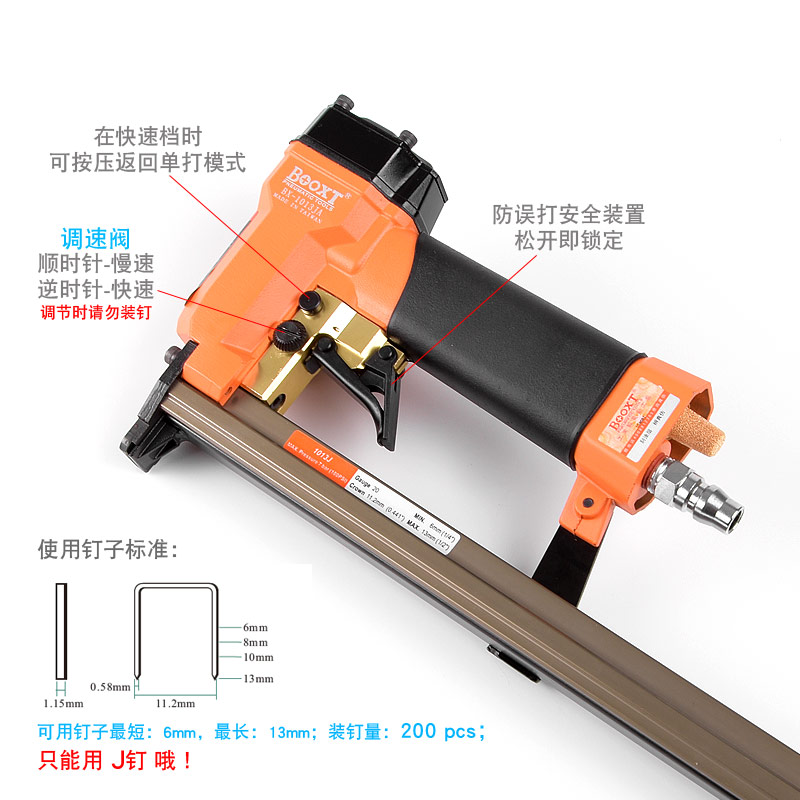 • 產(chǎn)品參數(shù): 特點:可調(diào)節(jié)快速連打,自帶防誤打安全開關(guān);釘子寬度:11.2mm;釘子跨度:10mm;釘腳尺寸:0.58×1.15mm;使用釘子長度范圍:6-13mm;裝釘量:200個;使用工作氣壓:0.6Mpa;推薦使用內(nèi)徑6.5mm氣管;平時多注意定時排放空壓機水份