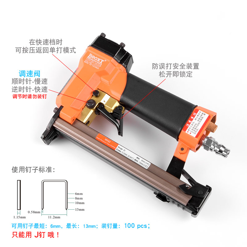• 產品參數(shù): 特點:可調節(jié)快速連打,自帶防誤打安全開關;釘子寬度:11.2mm;釘子跨度:10mm;釘腳尺寸:0.58×1.15mm;使用釘子長度范圍:6-13mm;裝釘量:100個;使用工作氣壓:0.6Mpa;推薦使用內徑6.5mm氣管;平時多注意定時排放空壓機水份